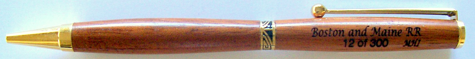 The limited edition (300) pen was hand crated from wood removed from a Boston and Maine passenger car. The car, originally #875, was built by the Pullman Company in 1897 as a combine, which is a car that is two thirds passenger seating and one third baggage area. The car was acquired from the Boston and Maine RR by the Strasburg Rail Road Company in 1962. It has been used by the company all these years until a complete restoration was undertaken and completed in June of 2000. Wood was saved during the restoration for these collectible pens. The car is now #62 and was given the name Gobbler's Knob. If you would like a ride on Gobbler's Knob or want more information on the Strasburg Rail Road Company call 717-687-7522 or e-mail srrtrain@prolog.net American Heritage Pens Maine Heritage Inc. MHI Old Town, Me. 207-659-5104 wpens@aol.com |